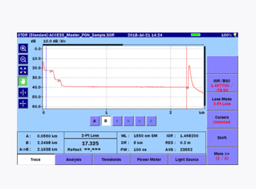 光脈沖測試可測量光纖傳輸損耗和光纖長度并檢測光纖連續(xù)性斷裂等事件。它同時支持單模和多模光纖,且產(chǎn)品線包括支持與測量環(huán)境匹配的各種波長。易于使用的光纖可視器功能使用兩種類型的實時掃描(高速、高 S/N)來檢查光纖連接和彎曲的狀態(tài),同時可監(jiān)控波形;可檢測具有高精度(最大 46 dB 動態(tài)范圍,0.8 m 盲區(qū))的光纖事件并測量損耗。出色的波形質(zhì)量支持從短距離到長距離的光纖測量,包括 PON 和實時測量。